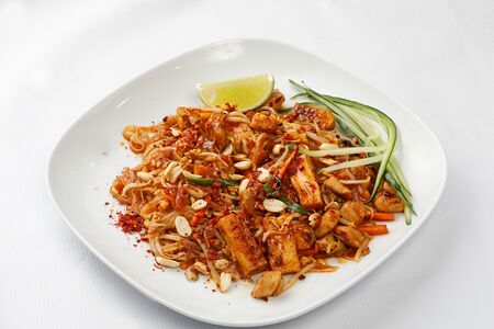 Рисовая тайская лапша с куриным филе, яйцом, арахисом, перчиком, морковью, ростками сои, огурцом и лаймом