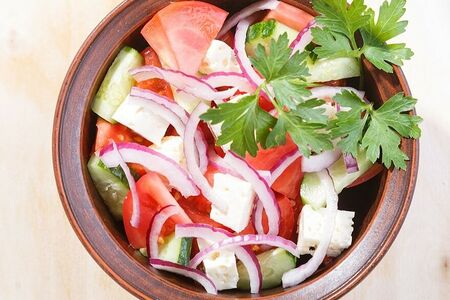 с помидорами, огурцами, сыром брынза и красным луком