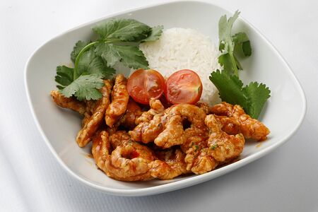 Куриное филе в панировке, фирменном тайском соусе с рисом жасмин, зеленью и томатами черри