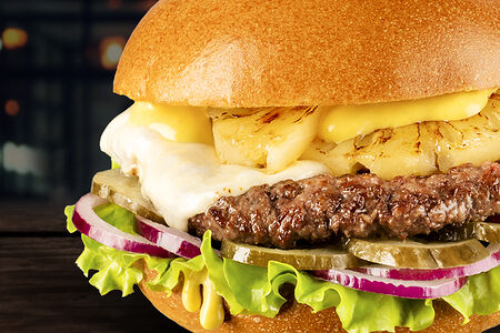 Домашняя булочка, котлета, уникальное сочетание обжаренного на гриле сладкого ананаса, фирменного гавайского соуса, маринованных огурчиков, красного лука, листьев салата и сыра моцарелла. Вспомни яркий отпуск или солнечное лето вместе с этим бургером