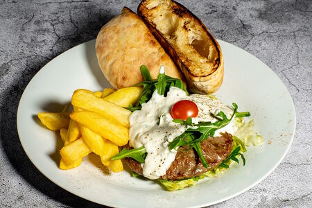 Стейк котлета из рубленой телятины, соусом из горгонзолы, свежие овощи, руккола.