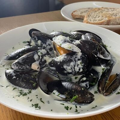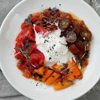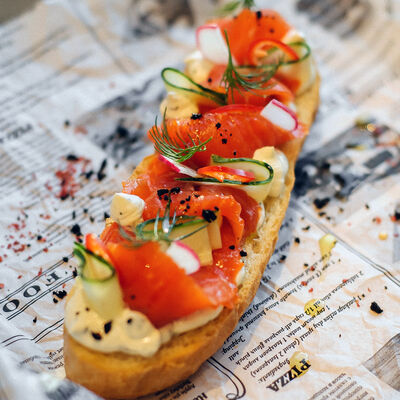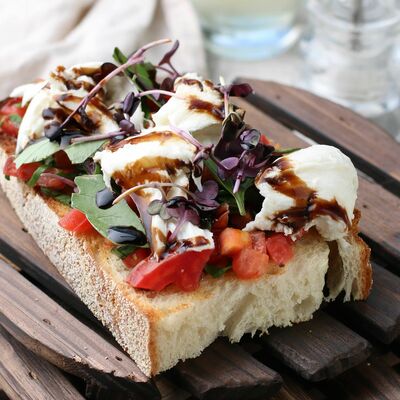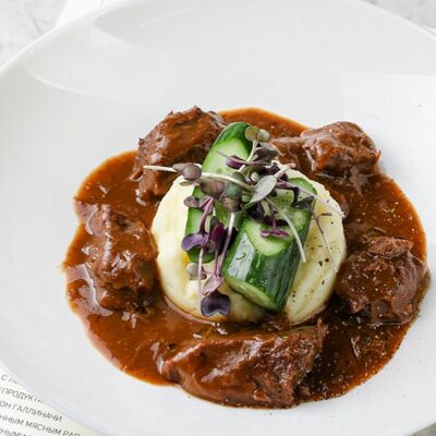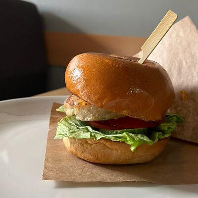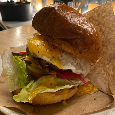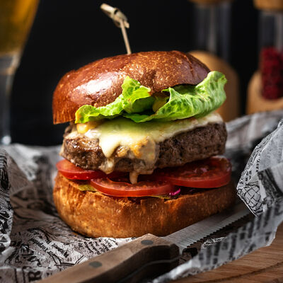 Котлета из говядины, сыр моцарелла, соус чеддер, маринованные огурчики, помидоры, булочка бриошь