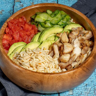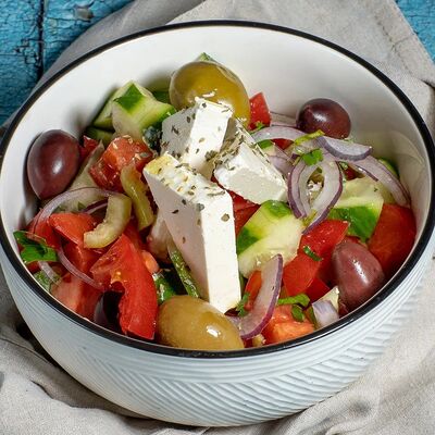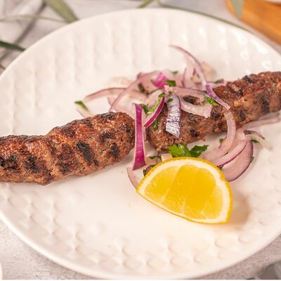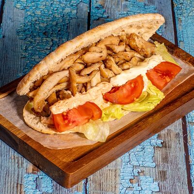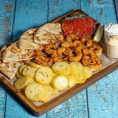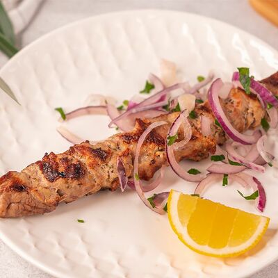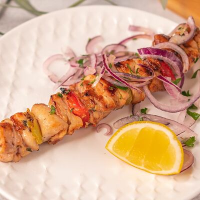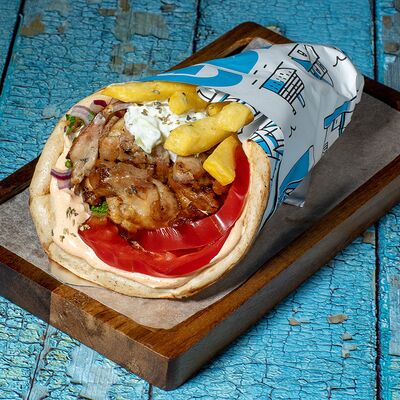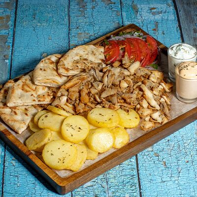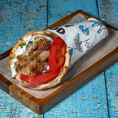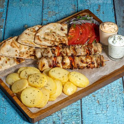 Шашлычок из свинины, греческая пита, соус дзадзыки, помидоры, красный лук с петрушкой
