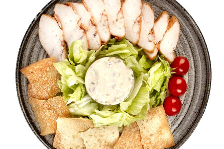 Любимый многими салат Цезарь, приготовленный по традиционному рецепту! Нежнейшее куриное филе, на подушке из салатных листьев, дополнено сочными помидорами черри, золотистыми хлебными чипсами и сыром пармезан.