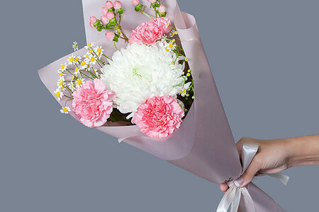 "Букет ""Цветочное вдохновение"" от бренда Ирис - это прекрасный выбор для тех, кто ценит красоту и качество. Этот букет состоит из хризантемы Бел Магнум, танацетума Камиллы белого, гиперикума розового и гвоздики микс сорта. Он упакован в два слоя упаковочного материала, что придает ему еще больше элегантности.