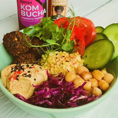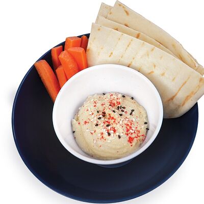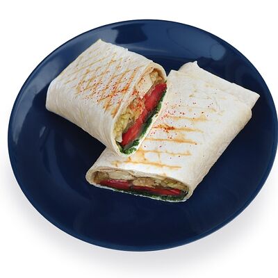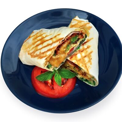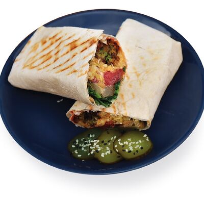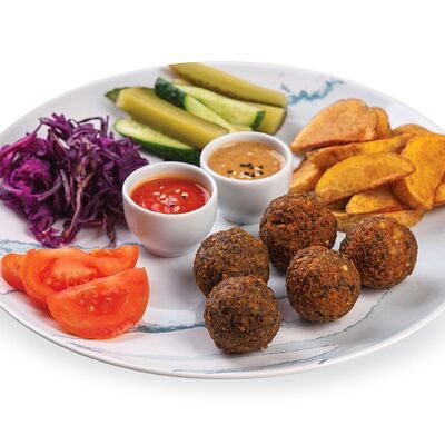 4 нутовые котлетки, маринованная красная капуста, соленые огурцы, свежие томаты, кинза, томатный и кунжутный соус, лаваш