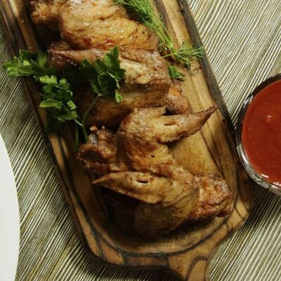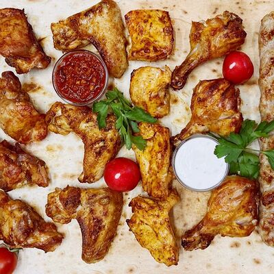 Куриные бедра, чесночный соус, острый перец, зелень, кетчуп, майонез, лук, помидоры