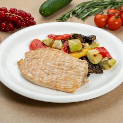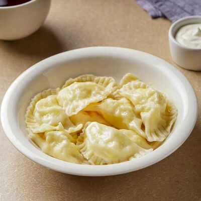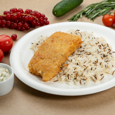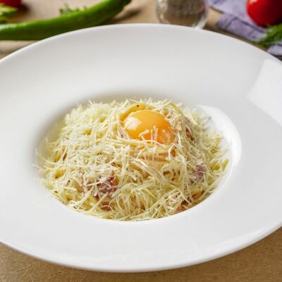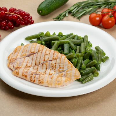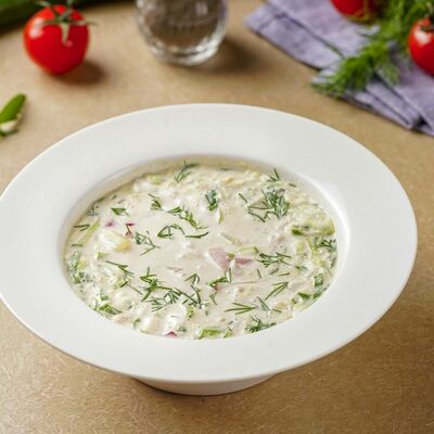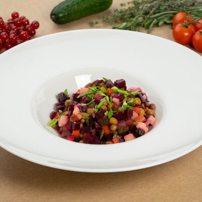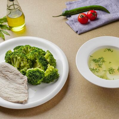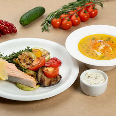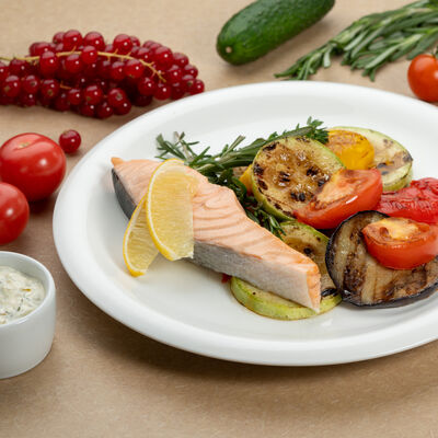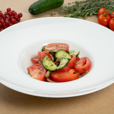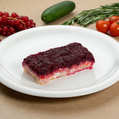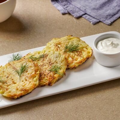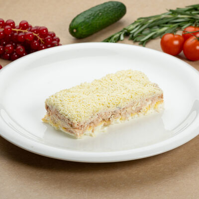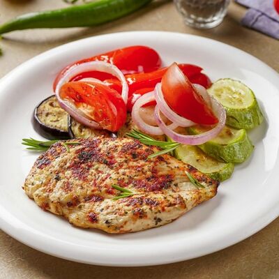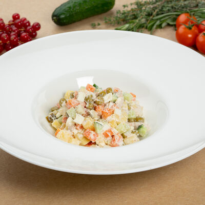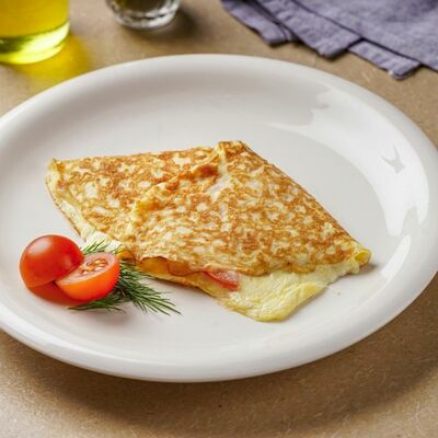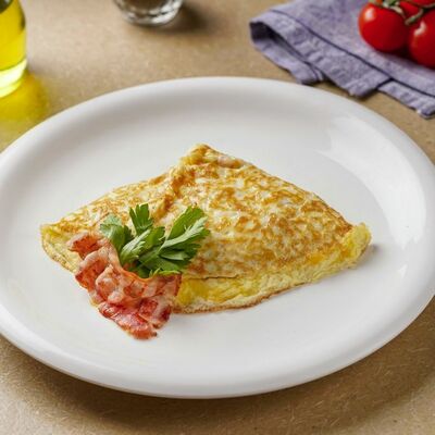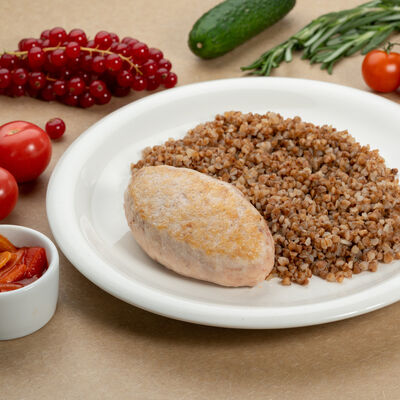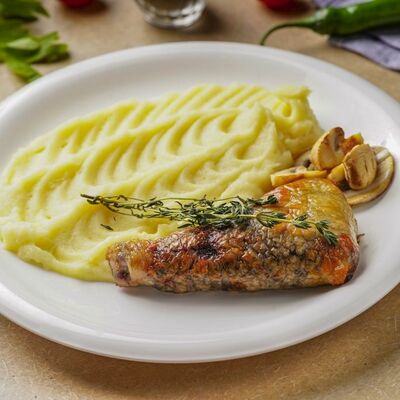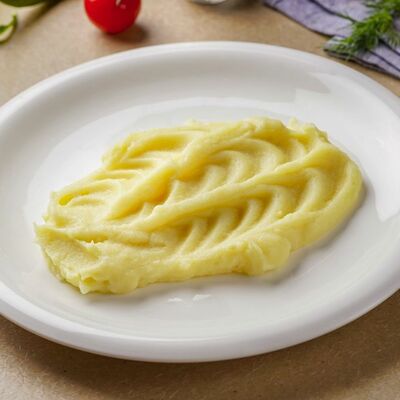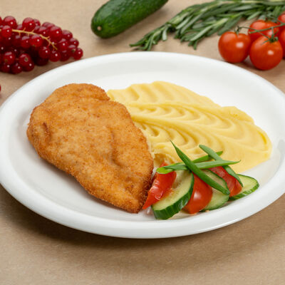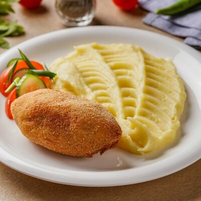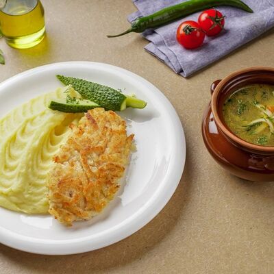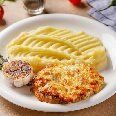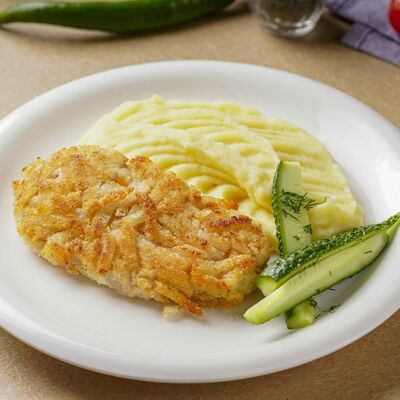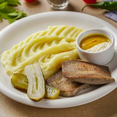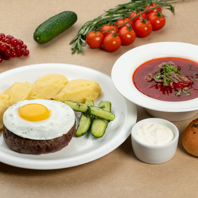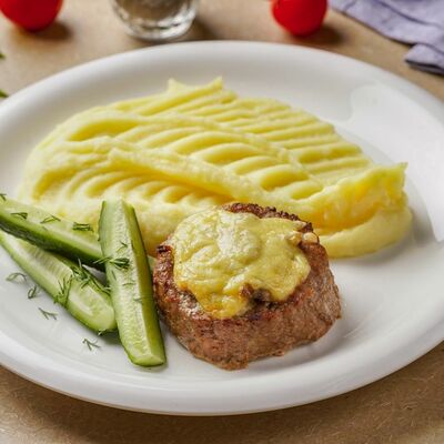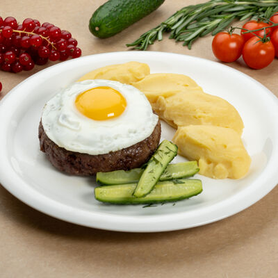 Бифштекс из рубленой говядины, жареное яйцо, картофельное пюре, малосольный огурец