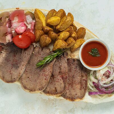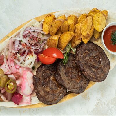 Цыпленок, картофель по-деревенски, лук репчатый