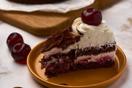 В основе торта шоколадный бисквит, легкий крем с добавлением сыра маскарпоне и цельная вишня. Торт украшен шоколадной стружкой и вишнями из полезного желе на основе вишневого сока. Остаточный срок годности не менее 36 часов, ТМ Народный Кондитер