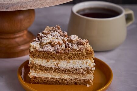 Нежные медовые коржи, приготовленные на основе натурального гречишного меда, пропитанные фирменным сметанным кремом на основе натуральной сметаны. Остаточный срок годности не менее 2 суток. Приборы не предоставляются