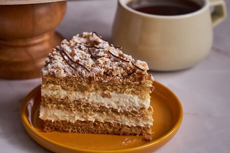 Нежные медовые коржи, приготовленные на основе натурального гречишного меда, пропитанные заварным кремом, украшенные сверху бисквитно-медовой крошкой и ганашом. Остаточный срок годности - не менее двух суток. Приборы не предоставляются