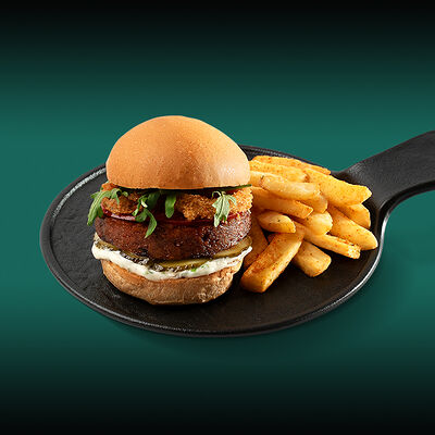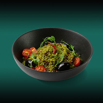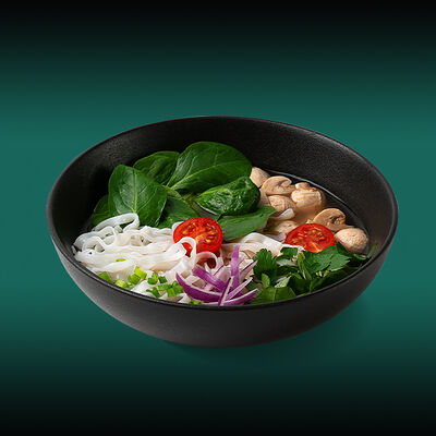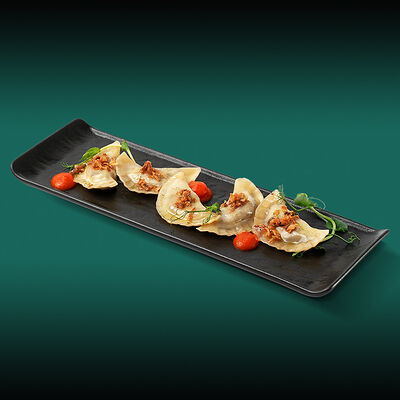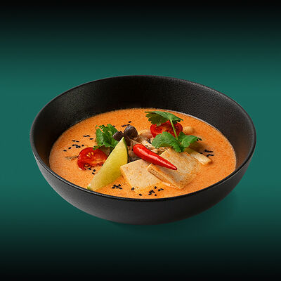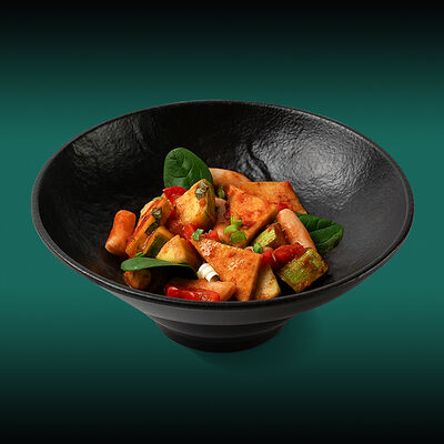 Паровой рис, обжаренный с куриным филе, овощами, яйцом, чесноком, соевым соусом и кунжутным маслом. Украшен соусом терияки, перцем чили, кунжутом и петрушкой