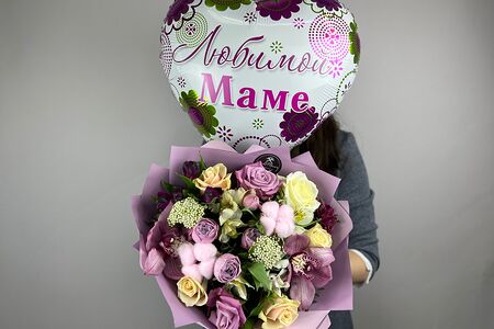 Альстромерия 5 шт., озотамнус 2 шт., орхидея цимбидиум 2 шт., писташ 1 шт., хлопок 2 шт., роза 7 шт., упаковка дизайнерская 2 шт., роза кустовая пионовидная 1 шт., шарик фольгированный сердце с гелием 1 шт.