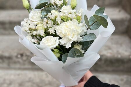 Белоснежный, лёгкий, Воздушный букет станет прекрасным подарком для любого поводаЭустома - 1 шт. Статица - 1 шт. Упаковка дизайнерская - 1 шт. Роза кустовая - 1 шт. Диантус - 1 шт. Эвкалипт - 1 шт