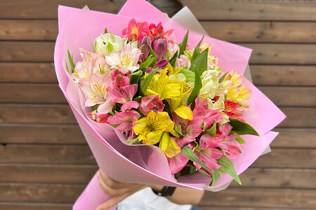 Альстромерия (11 шт.), фоамиран (1 шт.), пленка (1 шт.), лента атласная (1 шт.)