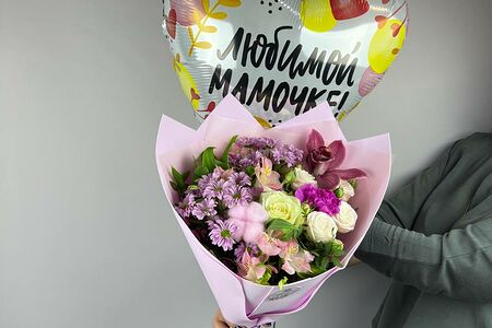 Шарик сердце (1 шт.), орхидея Цимбидиум (1 шт.), роза (1 шт.), роза кустовая (1 шт.), писташ (1 шт.), альстромерия (1 шт.), диантус (2 шт.), упаковка дизайнерская (1 шт.)