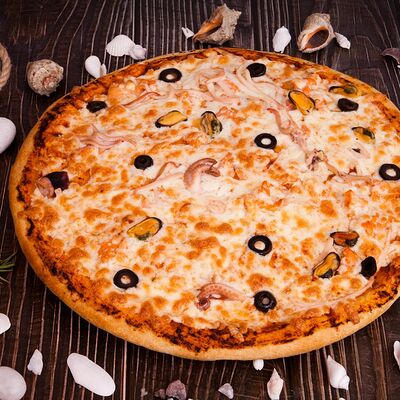 Соус для пиццы, семга, креветки, черные маслины, сыр моцарелла, соус тартар, тесто (40 см)
