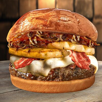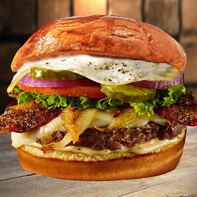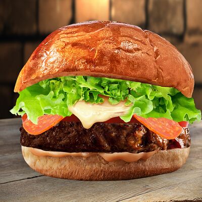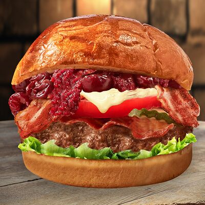Булочка, говяжья котлета, вишневый соус с беконом, сыр, айсберг, помидоры, чесночный соус