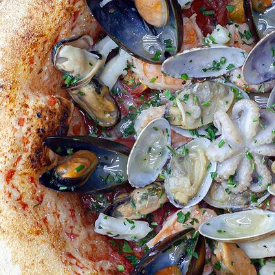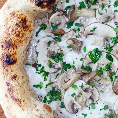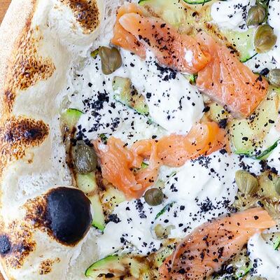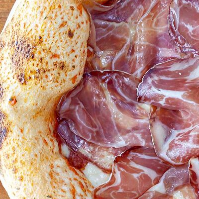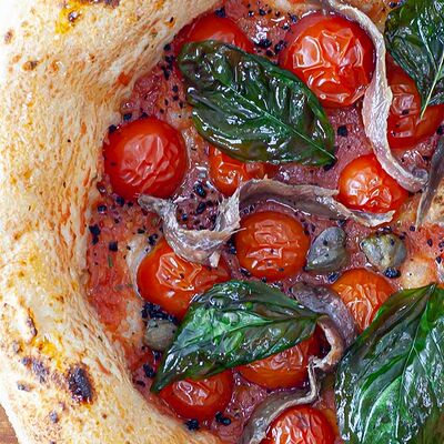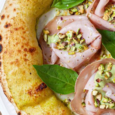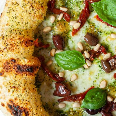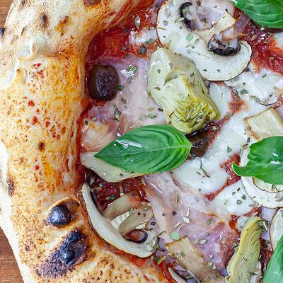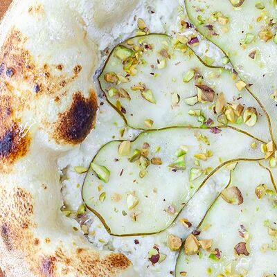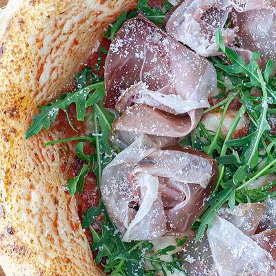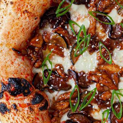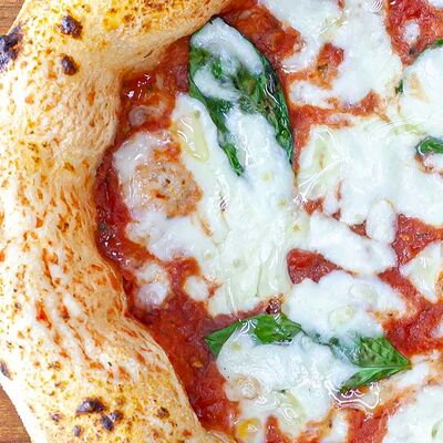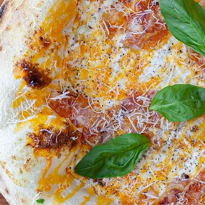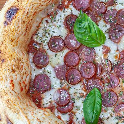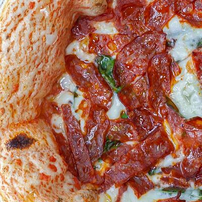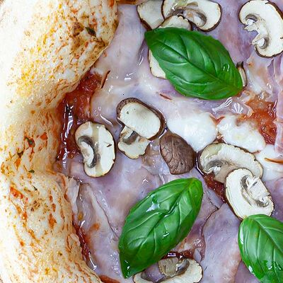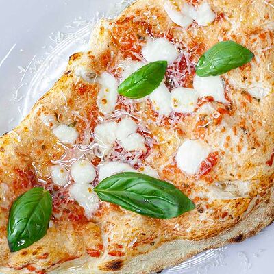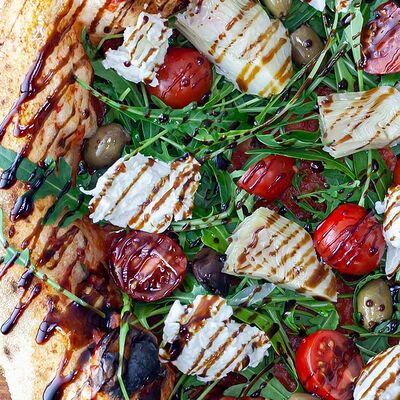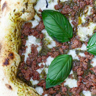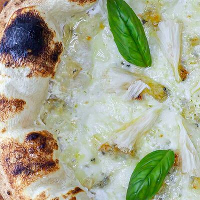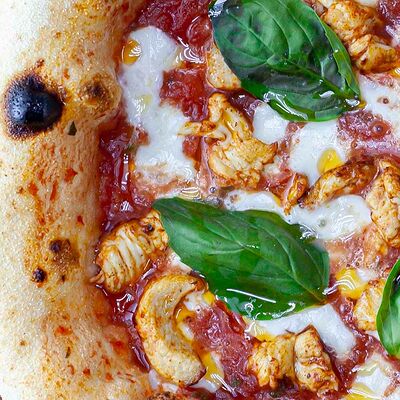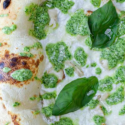 Куриная грудка гриль, песто из руколы собственного приготовления, моцарелла Fior di Latte, рикотта, базилик, оливковое масло первого холодного отжима (25 см)