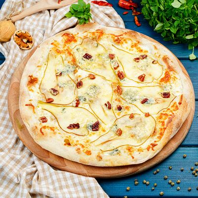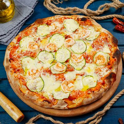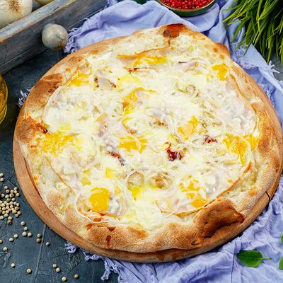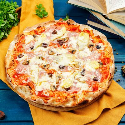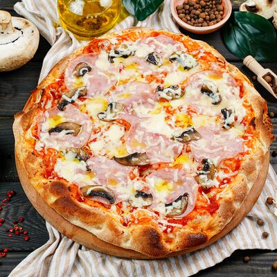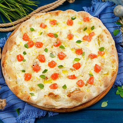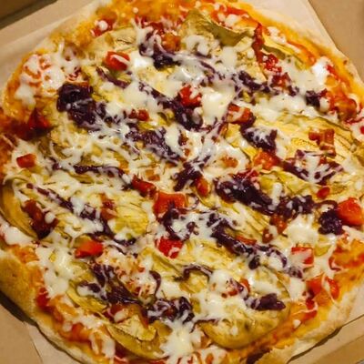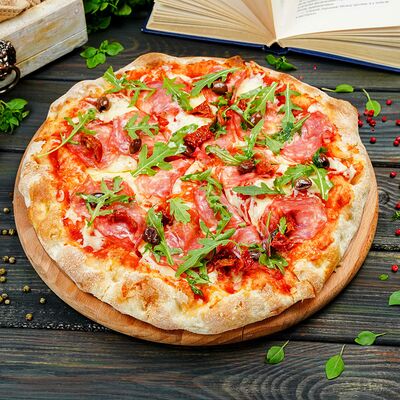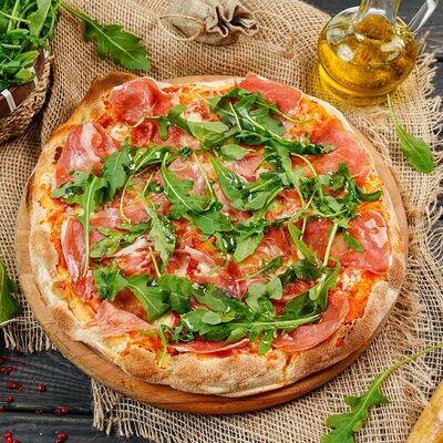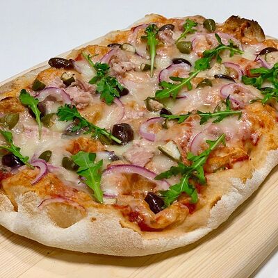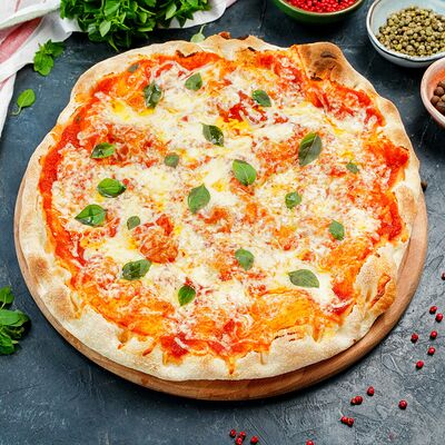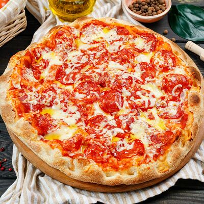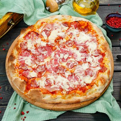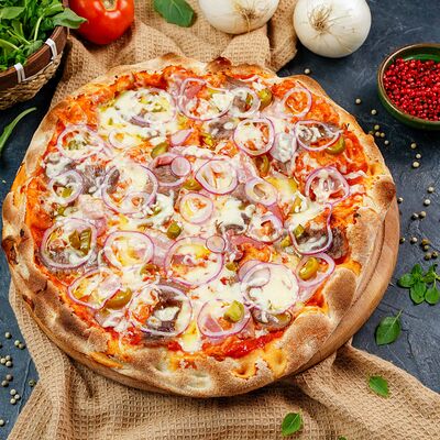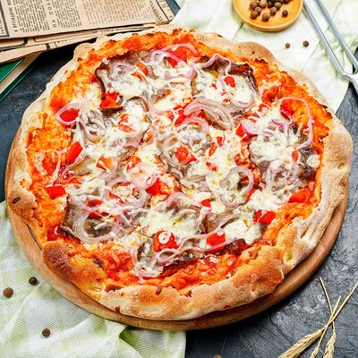 Корж из итальянской муки традиционной прямоугольной формы, соус помодоро, печеная паприка, запеченная 100% говядина, красный лук, сыр моцарелла (30×20 см)