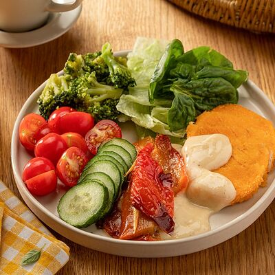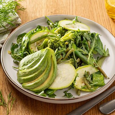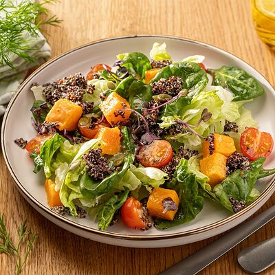 Креветки, овощная сальса (перец болгарский, огурец свежий, авокадо, манго, кинза, мята, соль, сок лайма, помидоры), смесь отварных круп, айсберг, романо, соус медово-горчичный (горчица зернистая, мед, масло оливковое, лимонный сок), помидоры черри, авокадо, лайм, шпинат, рукола, мята