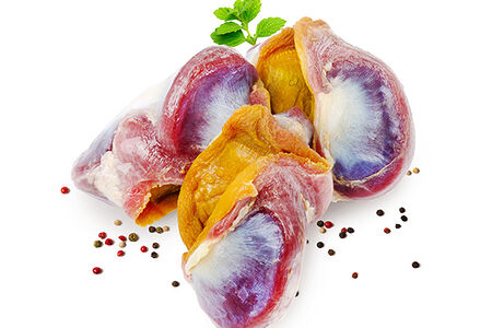 Желудок – мышечный орган, обладающий особой текстурой: достаточно упругой, умеренно плотной и хорошо сохраняющей форму. Мякоть имеет насыщенный бордовый оттенок, покрыта желтоватой тонкой плёнкой и обладает чуть сладковатым ароматом без посторонних запахов.