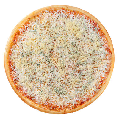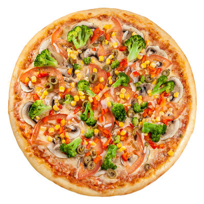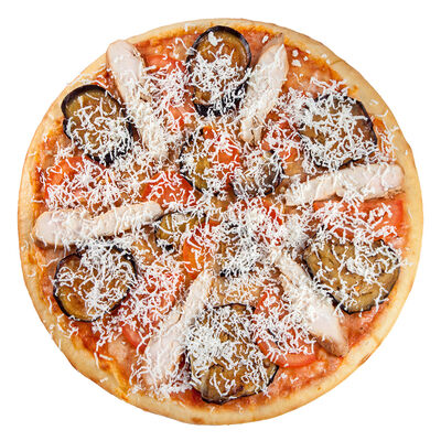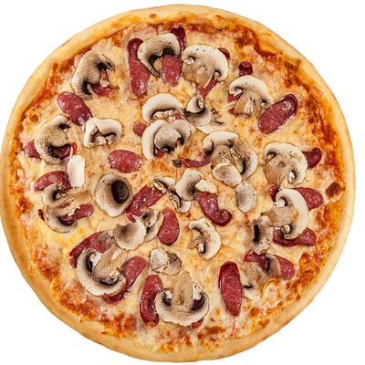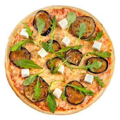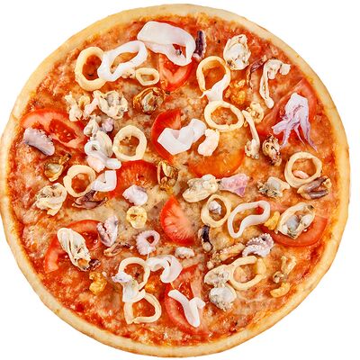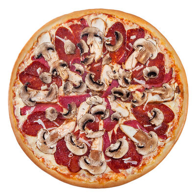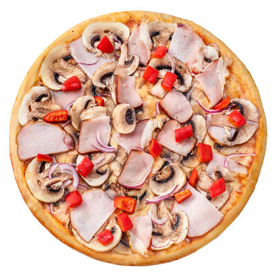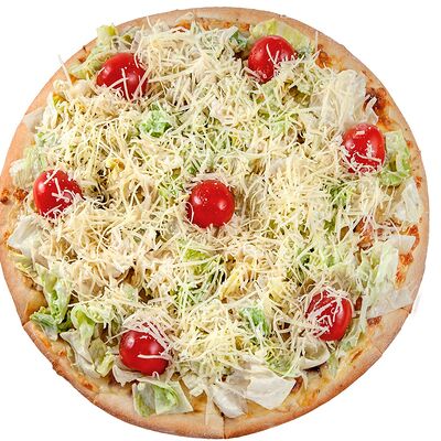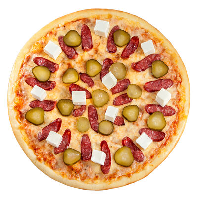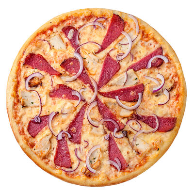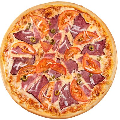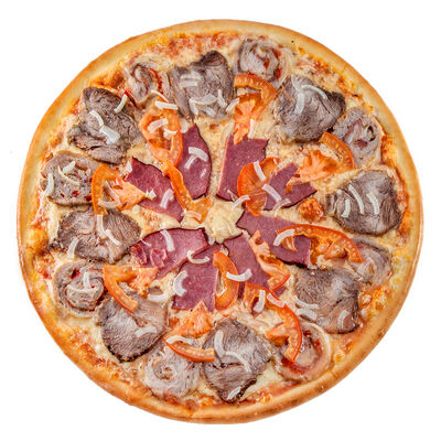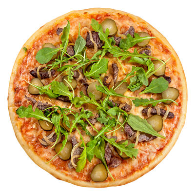 Соус наполи, сыр, орегано, телячья вырезка, руккола, лук, солёный огурец, помидоры черри (размер на выбор)