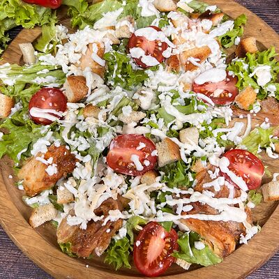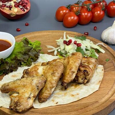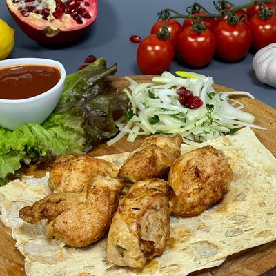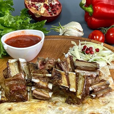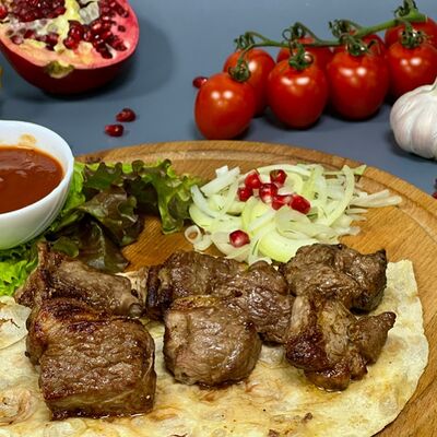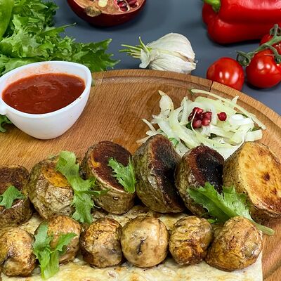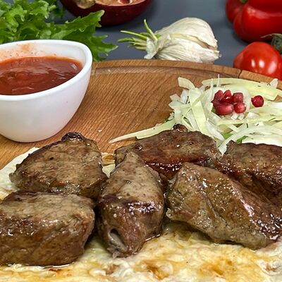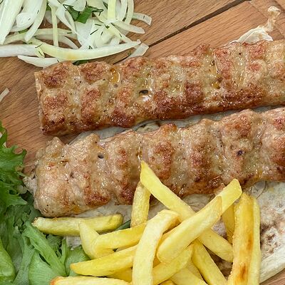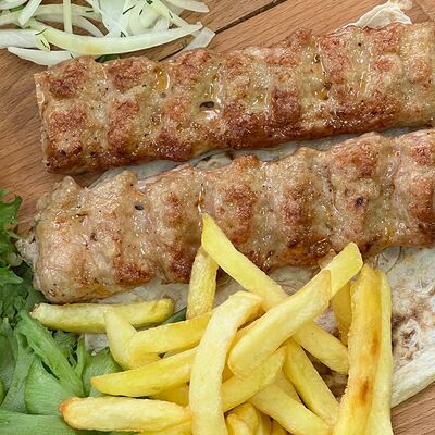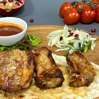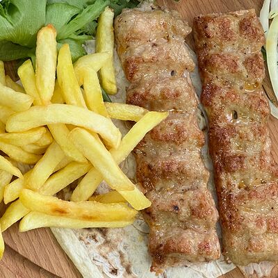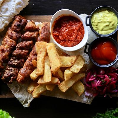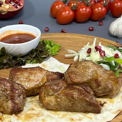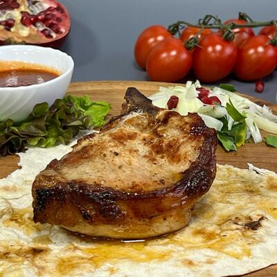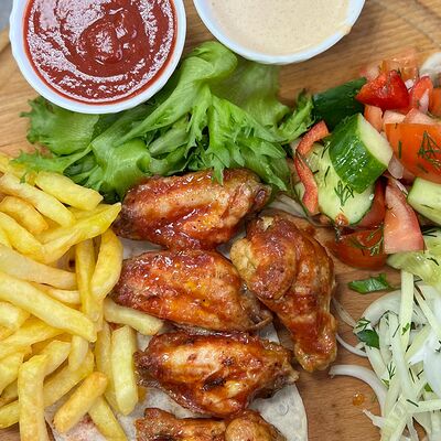Cвиная мякоть, Картошка фри, Салат летний, соус красный и чесночный