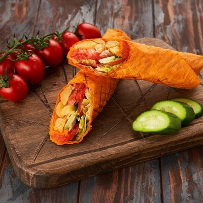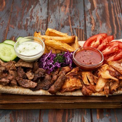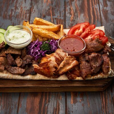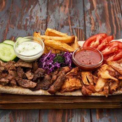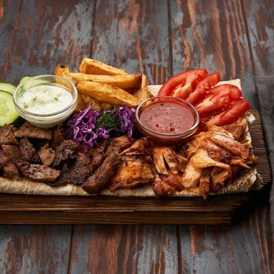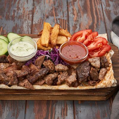 Огурцы, помидоры, соус от шефа, аджика, капуста белокочанная, лаваш, телятина