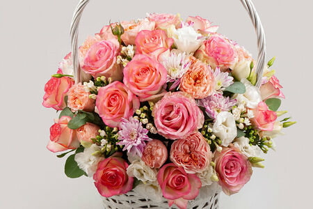 Бувардия (12 шт.), корзина средняя (1 шт.), роза кустовая (Кения) (3 шт.), роза микс (40 см, 12 шт.) (Россия), роза Эсперанс (7 шт.), хризантема кустовая (1 шт.), эвкалипт (5 шт.), эустома (3 шт.)