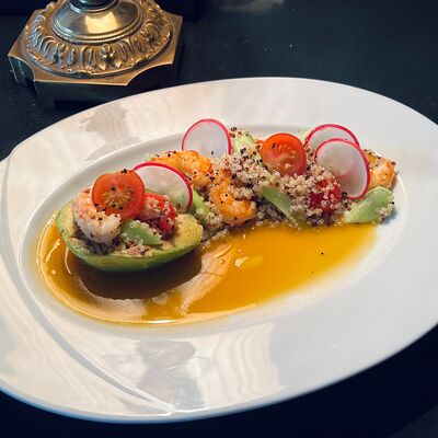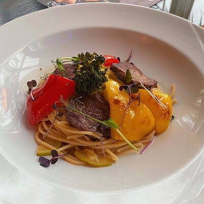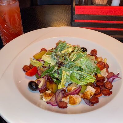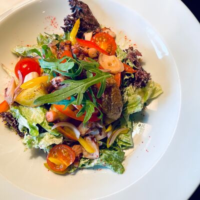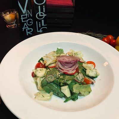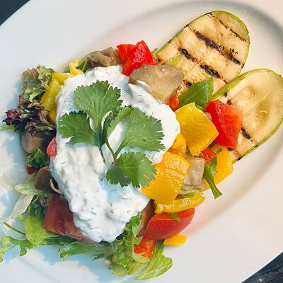 Микс-салат, перец болгарский красный и желтый, кабачок, баклажан, помидор, кинза, соус йогуртовый