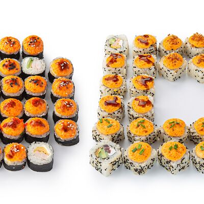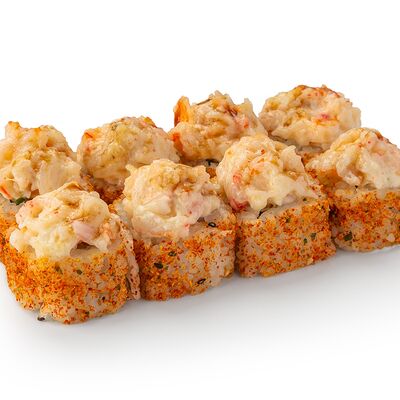 Тигровая креветка, сливочный сыр, томат, омлет тамаго, лук фри, зеленый лук, соус унаги, икра масаго, темпура, кунжут, соевый соус (30 мл)