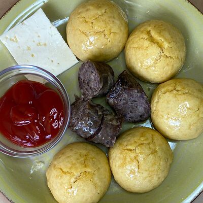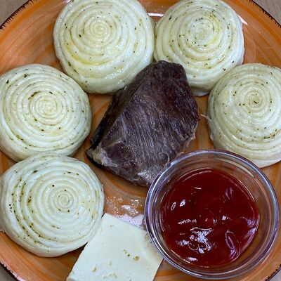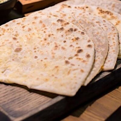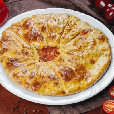 Тесто пресное (мука, вода, соль), микс сыров (гауда, сулугуни, творог), масло растительное, микс зелени (шпинат, кинза, лук зеленый)