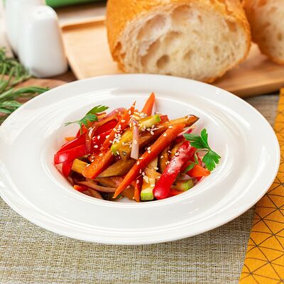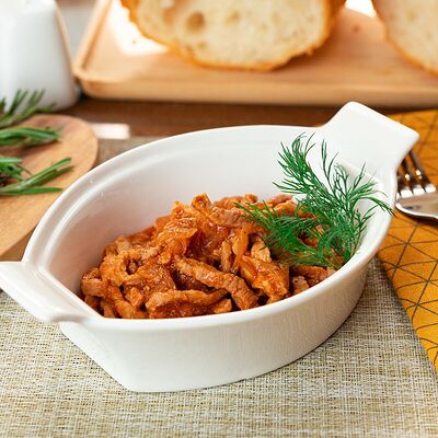 Вода очищенная, филе горбуши б/к, крупа пшеничная булгур, томатная паста, масло подсолнечное рафинированное дезодорированное, морковь столовая свежая, огурцы маринованные (огурцы, вода, сахар, соль, регулятор кислотности уксусная кислота, зелень укропа, лук), лук репчатый свежий, мука пшеничная в/с, масло сливочное (сливки пастеризованные), сахар, соль, чеснок свежий, перец черный молотый, крахмал картофельный, перец душистый горошком, лавровый лист. Мы тщательно вручную убираем все косточки из рыбы, принципиально не используя химические растворители для костей, поэтому в продукте может остаться небольшое количество рыбьих косточек. будьте аккуратны при употреблении рыбных блюд! Пищевая ценность (средние значения на 100 г продукта): белки - 7,3 г; жиры - 5,6 г; углеводы - 9,3 г. Энергетическая ценность (средние значения на 100 г продукта): 117 ккал/490 кДж.