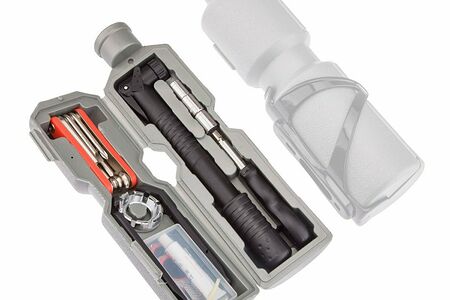 Набор вело инструментов KENLI KL-9806 состоит из 11 предметов. Футляр выполнен в виде складной велосипедной фляги, и помещается в стандартный фляг держатель. Набор включает в себя набор ключей (мультитул) из 7 элементов, ремкомплект для ремонта камер, лопатки для шиномонтажа, насос, головки под внешние шестигранники 8/9/10 мм, рукоятка с головкой на 6 мм, О-образный ниппельный ключ.