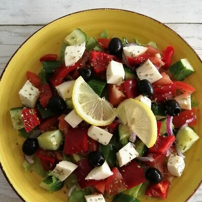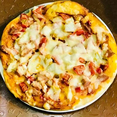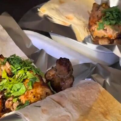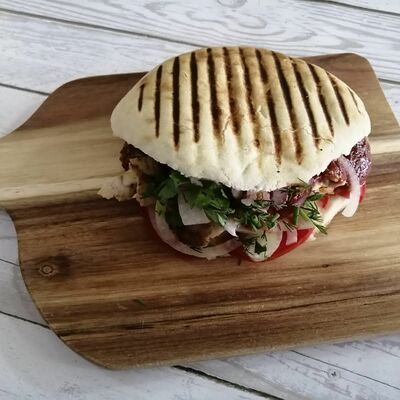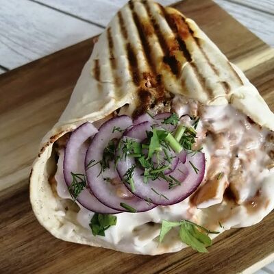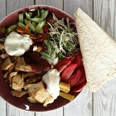 Лепёшка, курица или свинина, свежая капуста, свежие огурцы, свежие помидоры, лук, зелень, картошка фри, солёные огурцы, болгарский перец, солёный перец, соусы: чесночный, огуречный, томатный