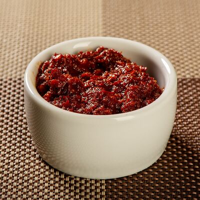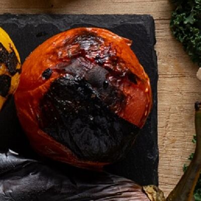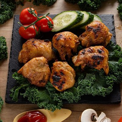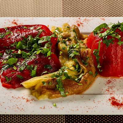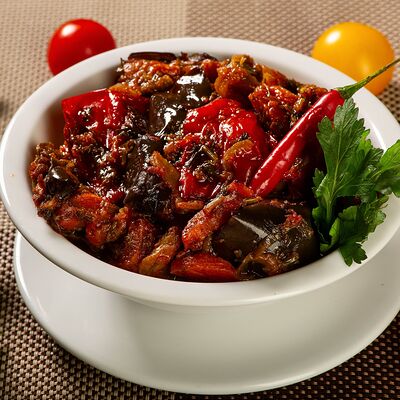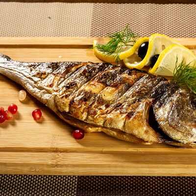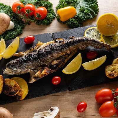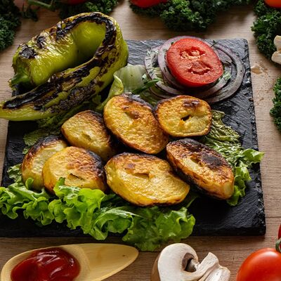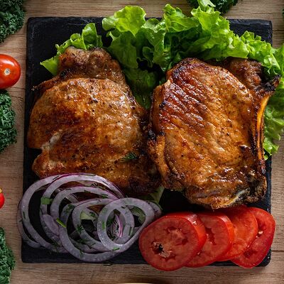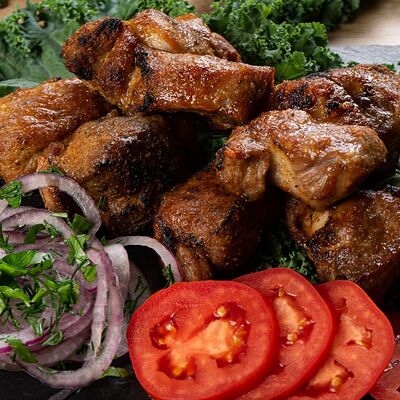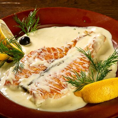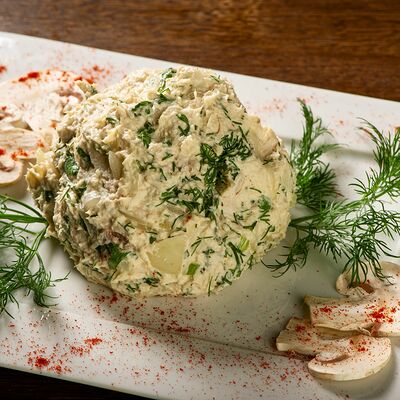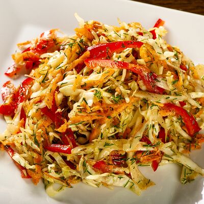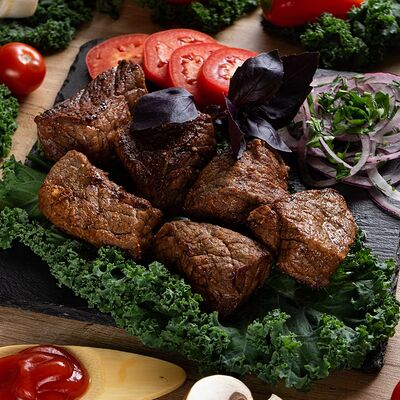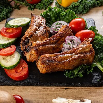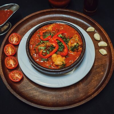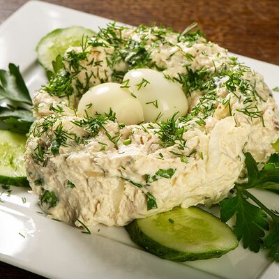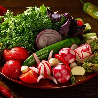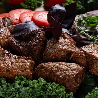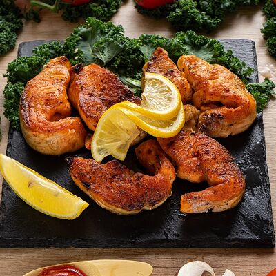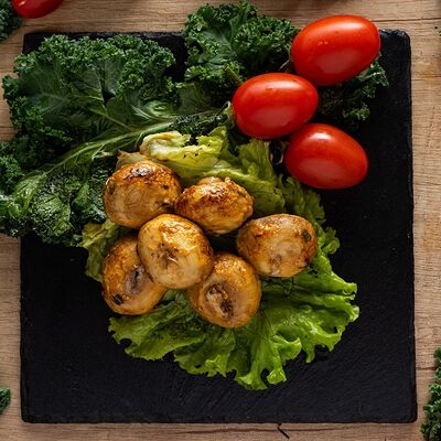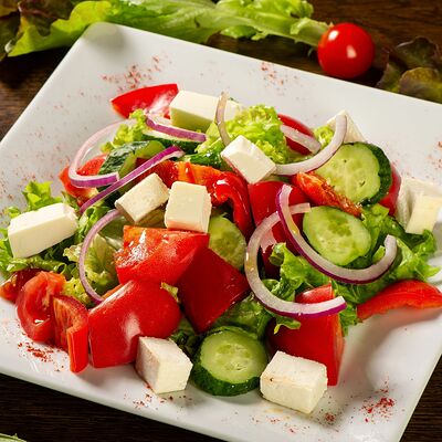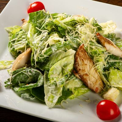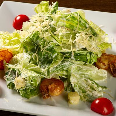 Салатный лист айсберг, обжаренные тигровые креветки, сыр пармезан, свежие томаты черри, чесночные гренки, соус цезарь