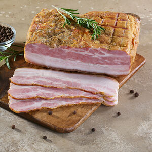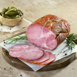Аппетитная варено-копченая свиная грудинка без кости. Нежное, упругое мясо с тонкими прожилками шпика и пряным ароматом копчения и специй. Отлично подходит для приготовления супов, придавая им великолепный аромат копчения.