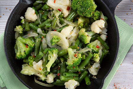 Чтобы вы не тратили время на поиски рецептов, выбор, чистку и нарезку овощей, мы уже все подготовили заранее! Овощи для рагу с брокколи и фасолью нарезаны оптимальным образом. Во-первых, от правильной нарезки зависят вкус и внешний вид готового блюда. А во-вторых, все ингредиенты равномерно приготовятся. Так рагу будет выглядеть аппетитно, порадует яркими сочными красками и великолепным вкусом.
