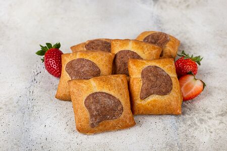 Изящные конвертики изготавливаются из тонко раскатанного нежного песочного теста на твороге с начинкой из натуральной клубники. Сверху пирожное украшается сердцем из теста на твороге.