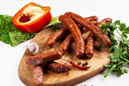 Подкопченые колбаски из говядины и свиниы с добавлением крупного шпика, с ароматом чеснока и специй в натуральной оболочке. Рецептура ГОСТ. Мясной продукт категории В охлажденный. Фламбированные колбаски особенно интересны и вкусны!