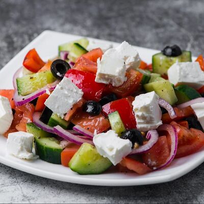Сыр фета, помидоры, огурцы, перец болгарский, чёрные маслины без косточек, лук репчатый красный, масло оливковое, лимон, соль, перец чёрный молотый