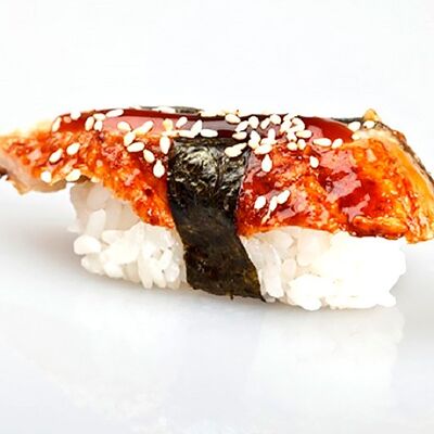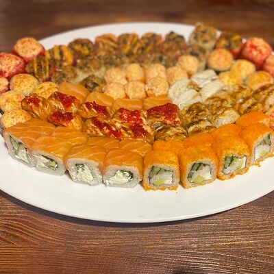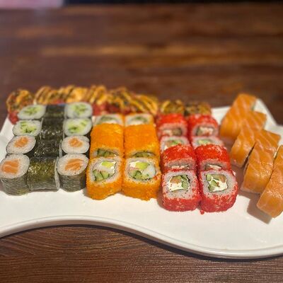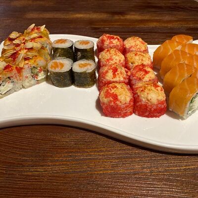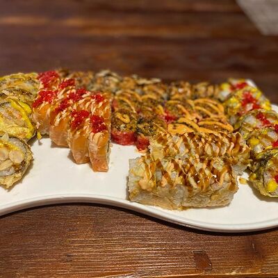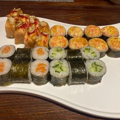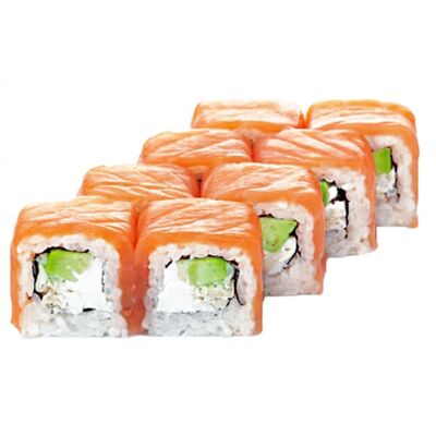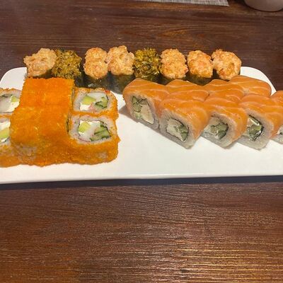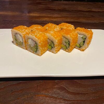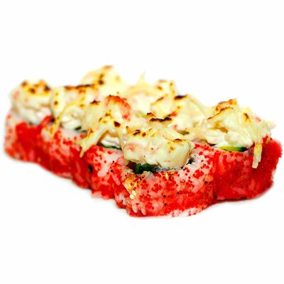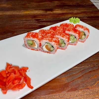 Рис, нори, лосось, авокадо, творожный сыр, икра масаго, сухари темпура