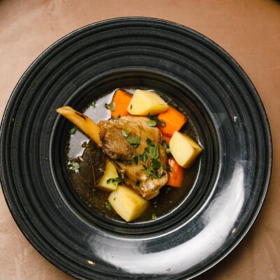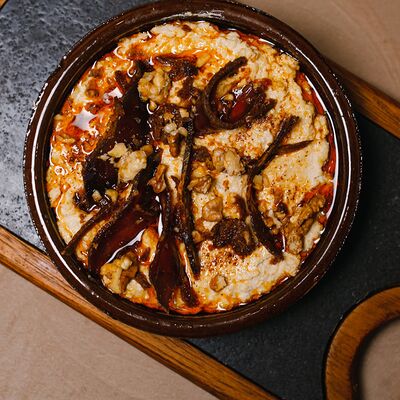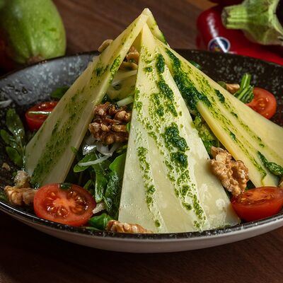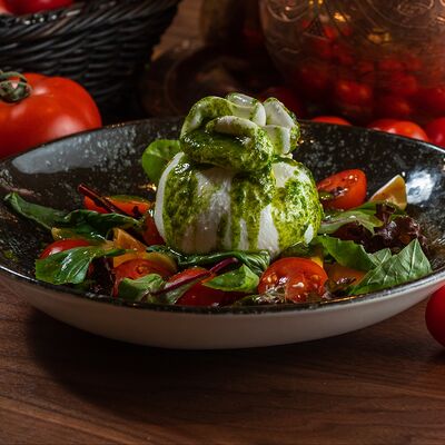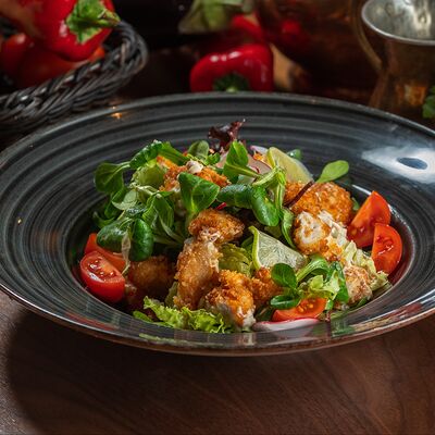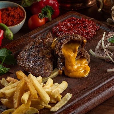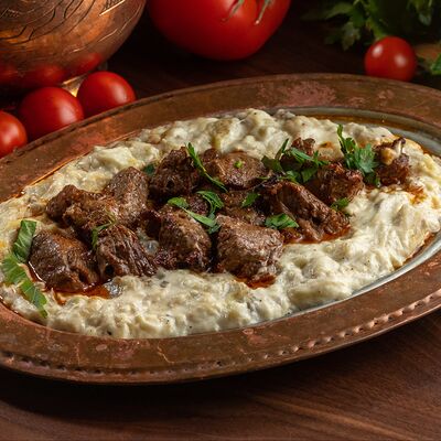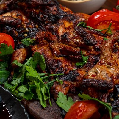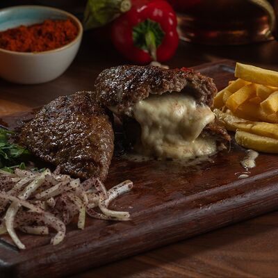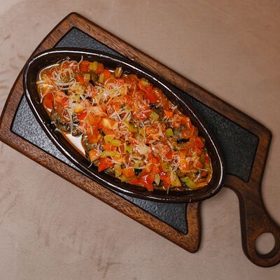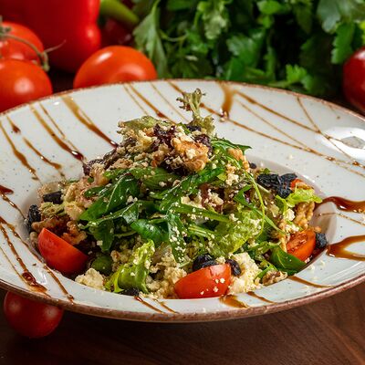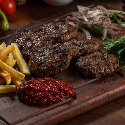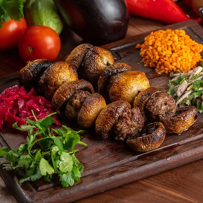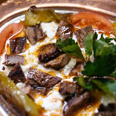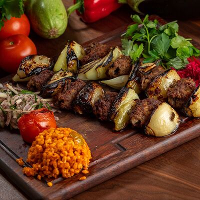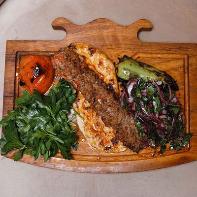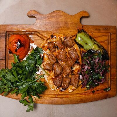 Мякоть баранья, булгур, лук, помидоры, перец, лепешка, петрушка