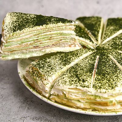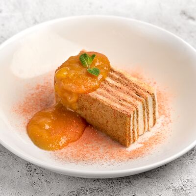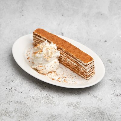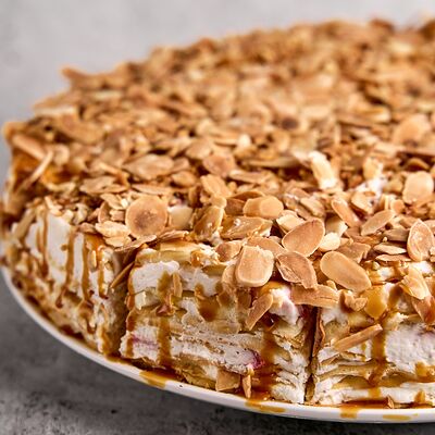 Блинный торт с клубникой, соленой карамелью и миндалем доставка