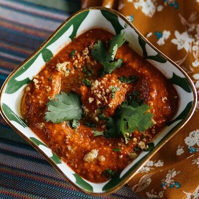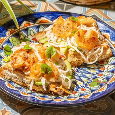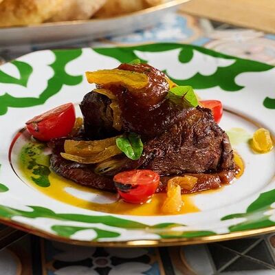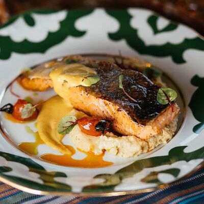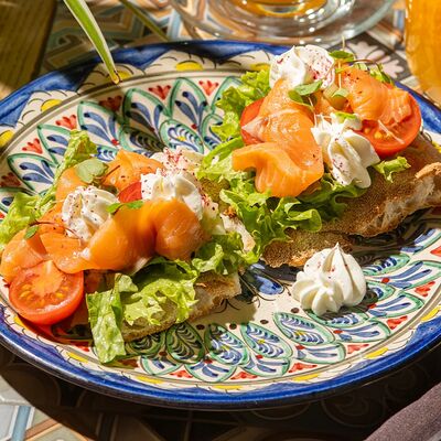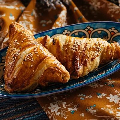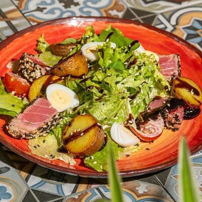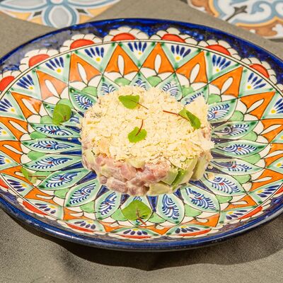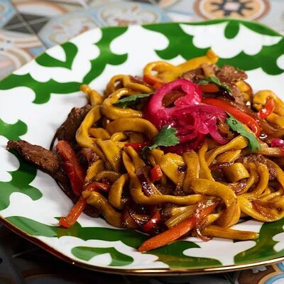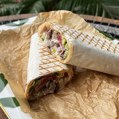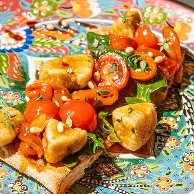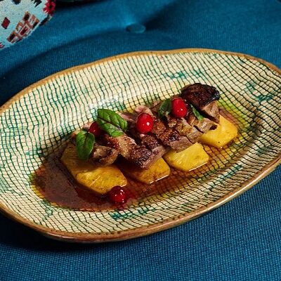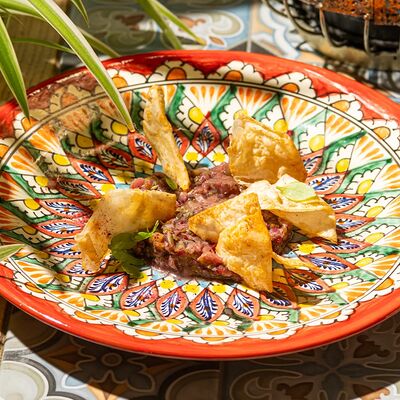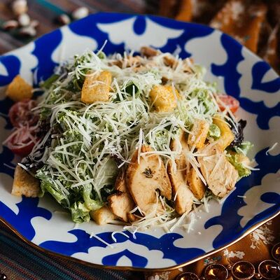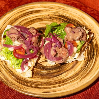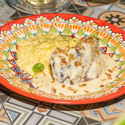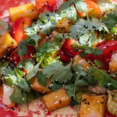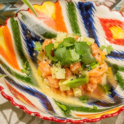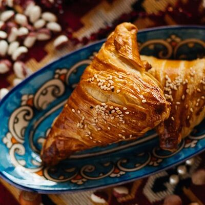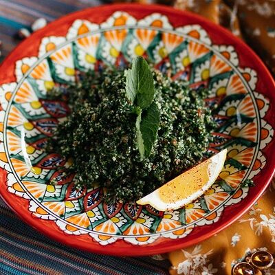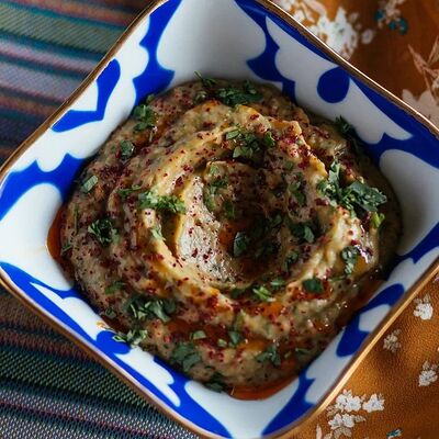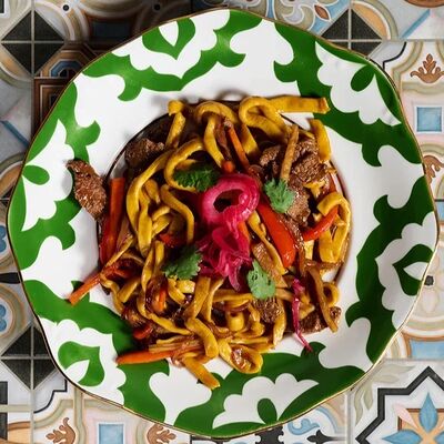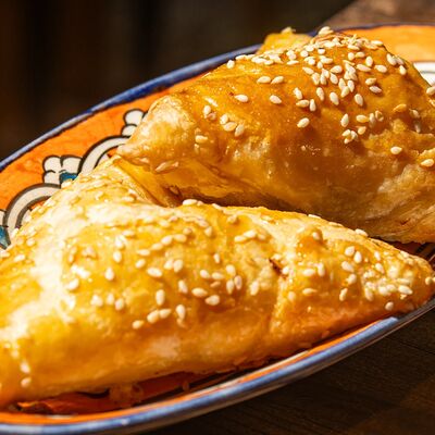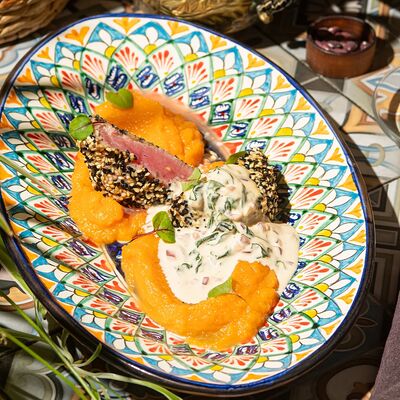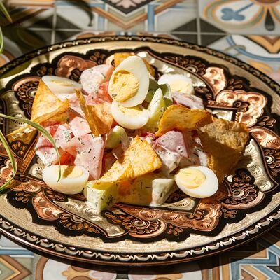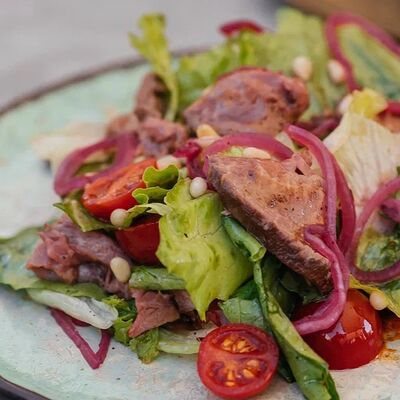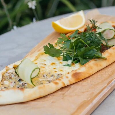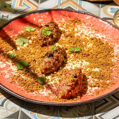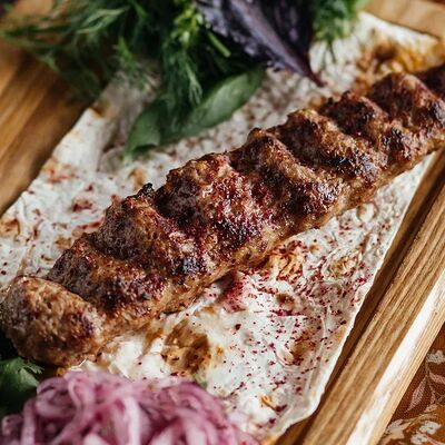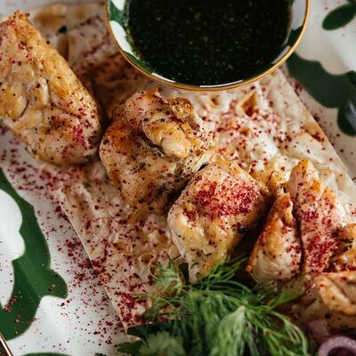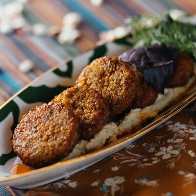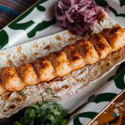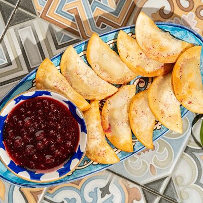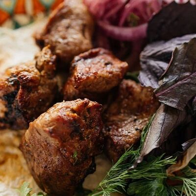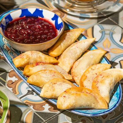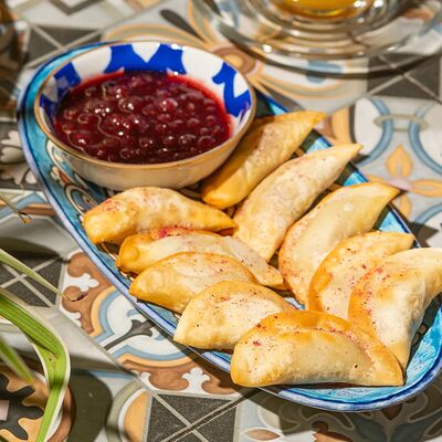 Пельмени с бараниной, обжаренные до полной готовности, подаются с кавказским миксом, белым соусом и посыпаются сумахом