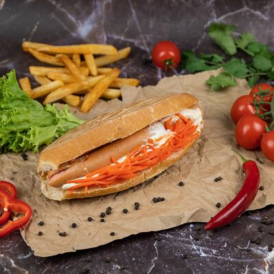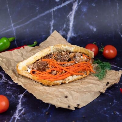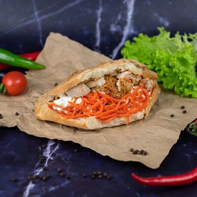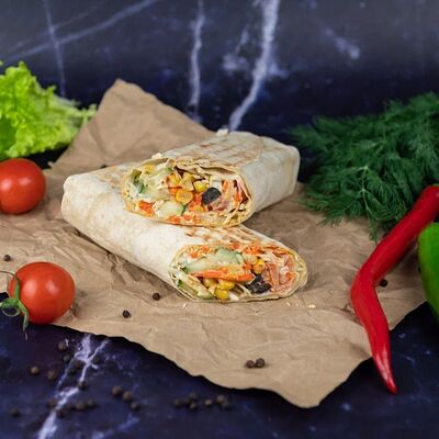 Лаваш, капуста, морковь по-корейски, огурец, помидор, лук, соус чесночный, соус томатный, курица