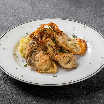 Три тонких свиных отбивных в панировке, вино, сливочное масло, соль, перец, лук, картофельное пюре, зелень