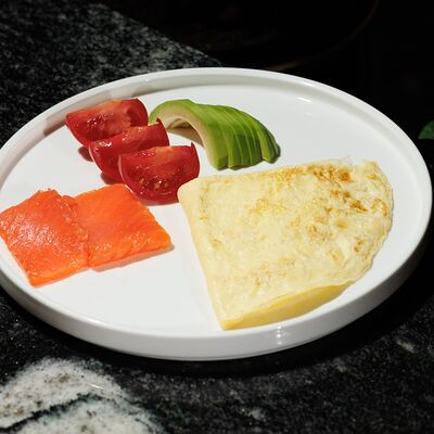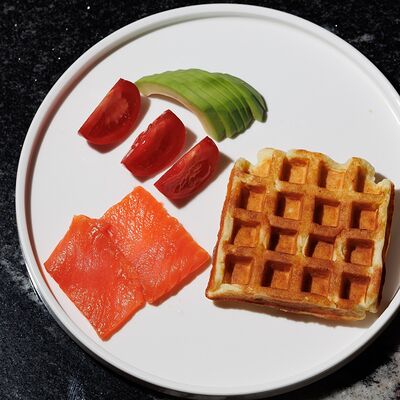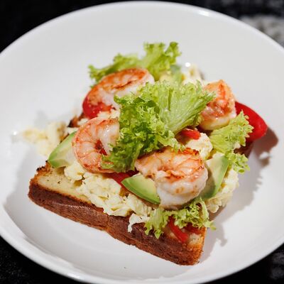 Креветка, крем-чиз, томат, авокадо, огурец, сладкий чили, лист салата, тостовый хлеб